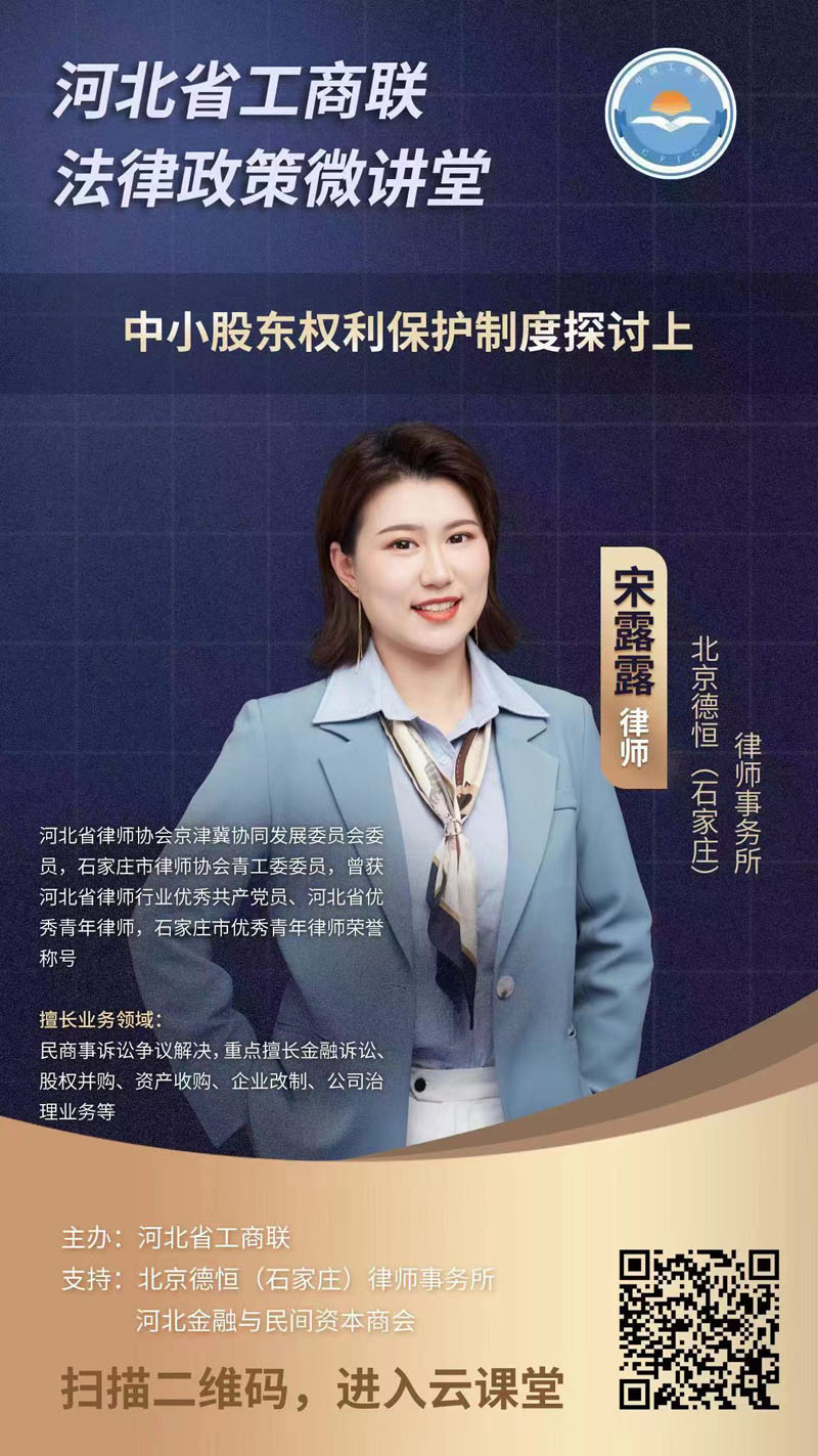 《省工商联法律政策微讲堂》上线了由北京德恒律所石家庄办公室律师主讲的“中小股东权利保护制度探讨”,请积极转发宣传海报,组织会员通过识别海报中的二维码观看。